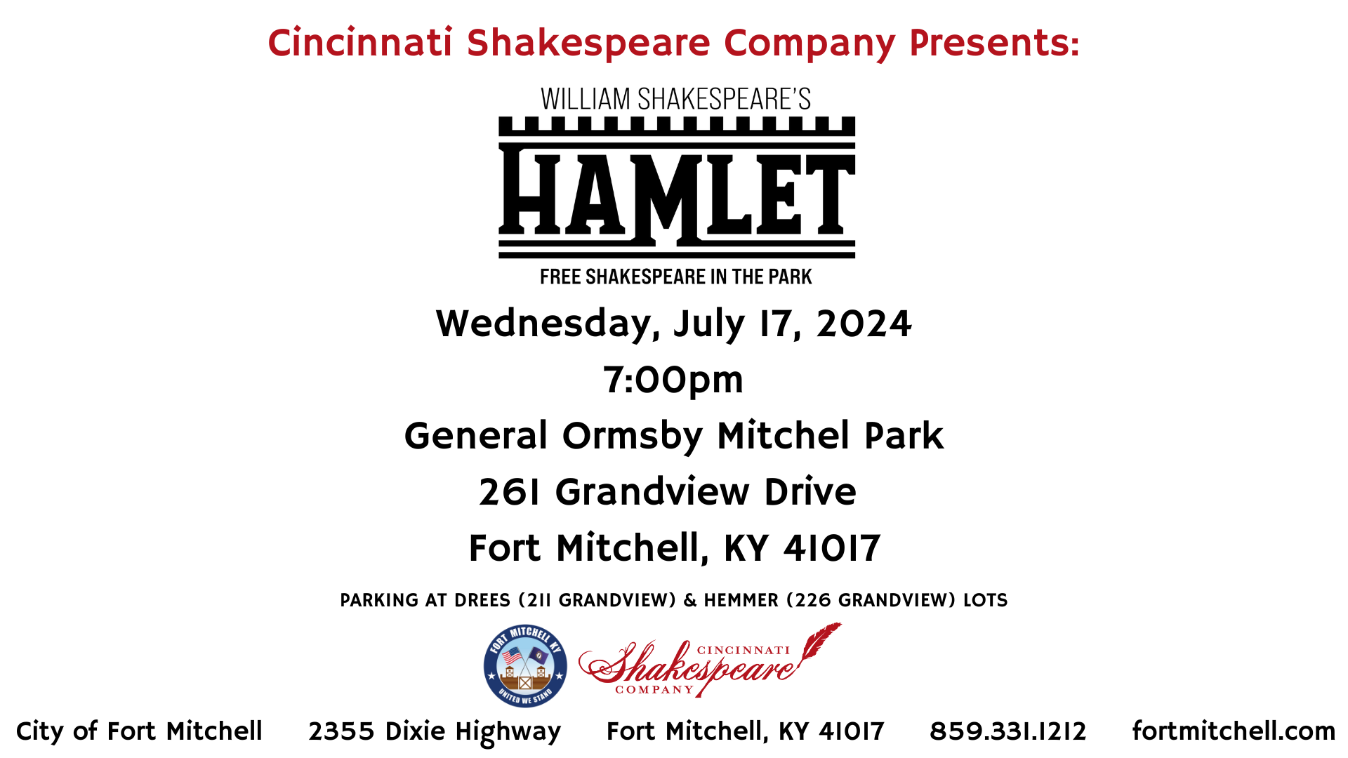 Cincinnati Shakespeare Company Presents: Hamlet Wednesday, July 17, 2024 7:00pm – 9:00pm General Ormsby Mitchel Park 261 Grandview Drive Fort Mitchell, KY 41017