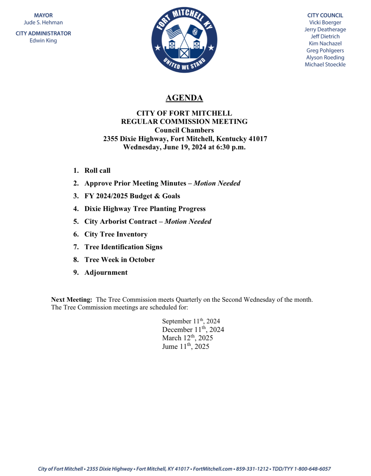 City of Fort Mitchell Tree Board Meeting Agenda 6-19-24