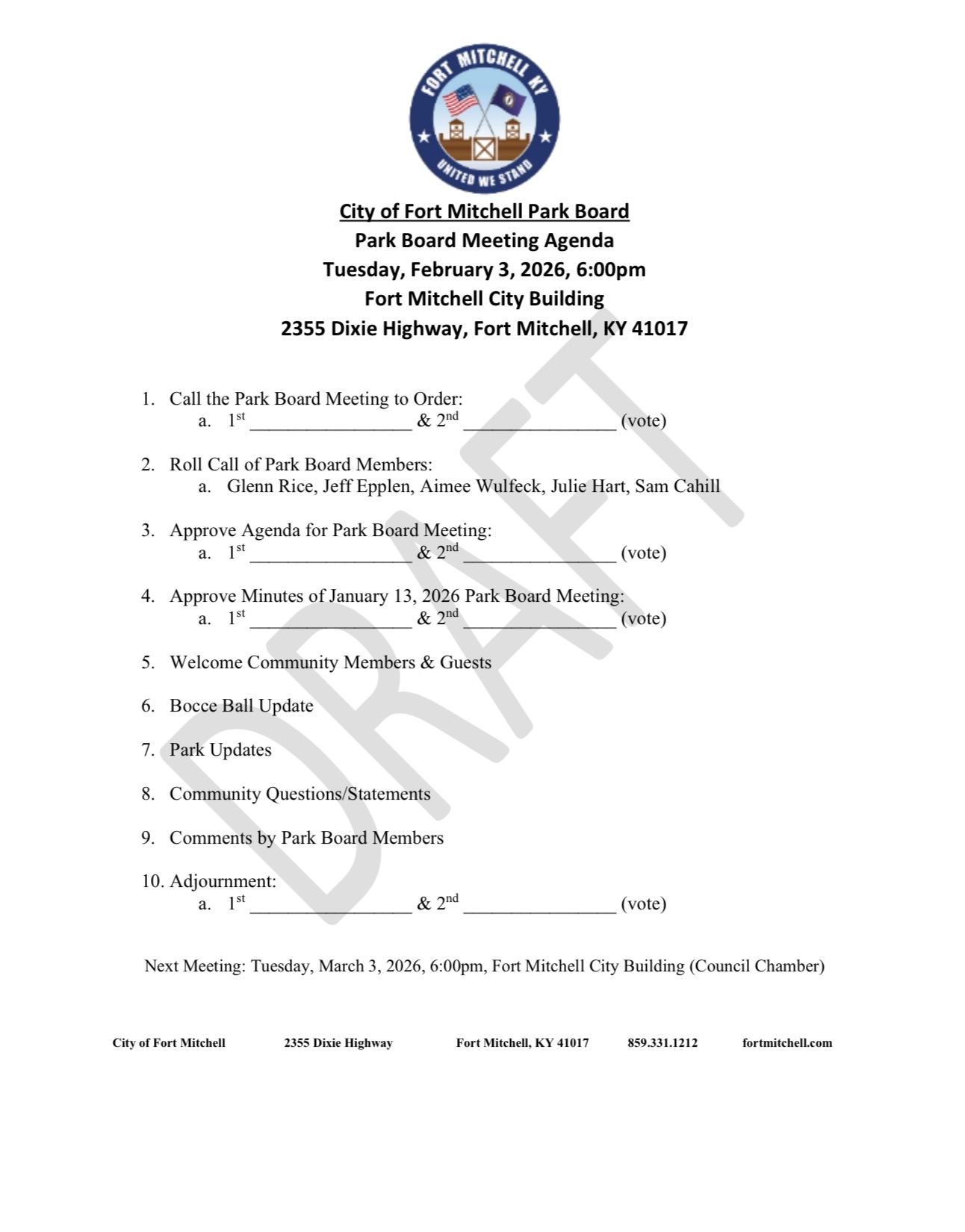 City of Fort Mitchell Park Board Meeting Agenda 2-3-26 City of Fort Mitchell Park Board Meeting Tuesday, February 3, 2026 6:00pm Fort Mitchell City Building (Council Chamber) 2355 Dixie Highway Fort Mitchell, KY 41017