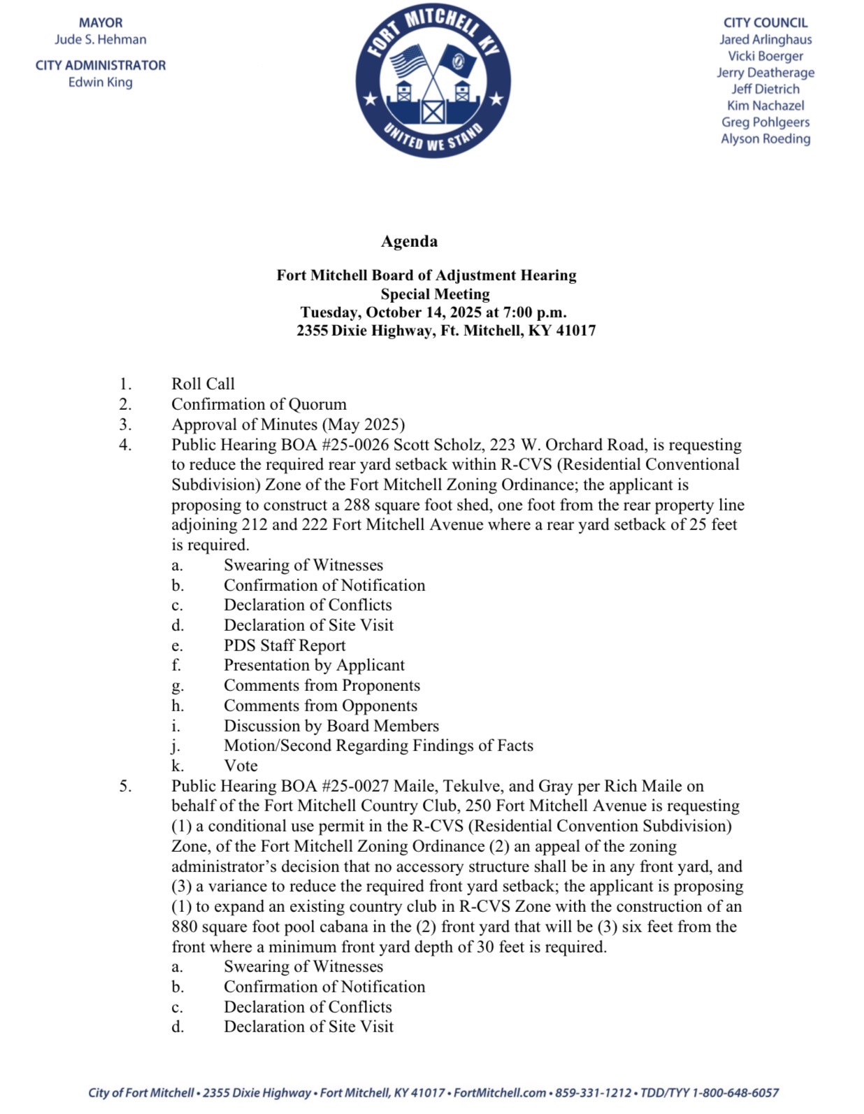 City of Fort Mitchell Board of Adjustment Meeting Agenda 10-14-25 City of Fort Mitchell Board of Adjustment Meeting Tuesday, October 14, 2025 7:00pm City Building (Council Chamber) 2355 Dixie Highway Fort Mitchell, KY 41017