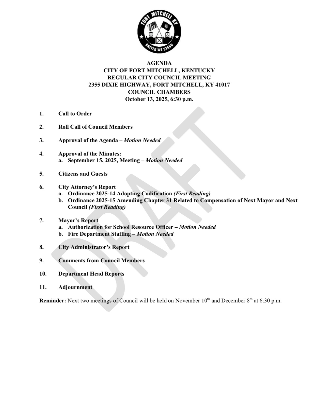 City of Fort Mitchell Council Meeting Agenda 10-13-25 City of Fort Mitchell City Council Meeting Monday, October 13, 2025 6:30pm City Building (Council Chamber) 2355 Dixie Highway Fort Mitchell, KY 41017
