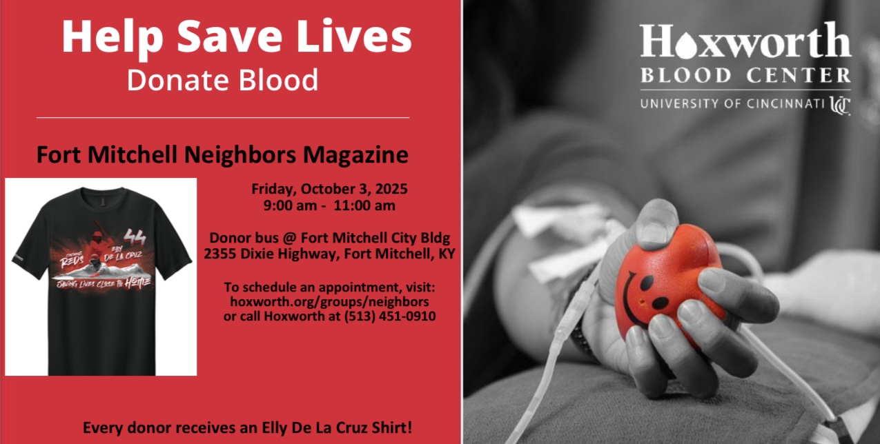 Hoxworth/Fort Mitchell Neighbors Magazine Blood DriveFriday, October 3, 20259:00am - 11:00amFort Mitchell City Building (Parking Lot)2355 Dixie Highway, Fort Mitchell, KY 41017 Schedule an appointment at:https://donateblood.uc.edu/donor/schedules/drive_schedule/52792 Or call Hoxworth at 513-451-0910 All donors get an Elly De La Cruz t-shirt!