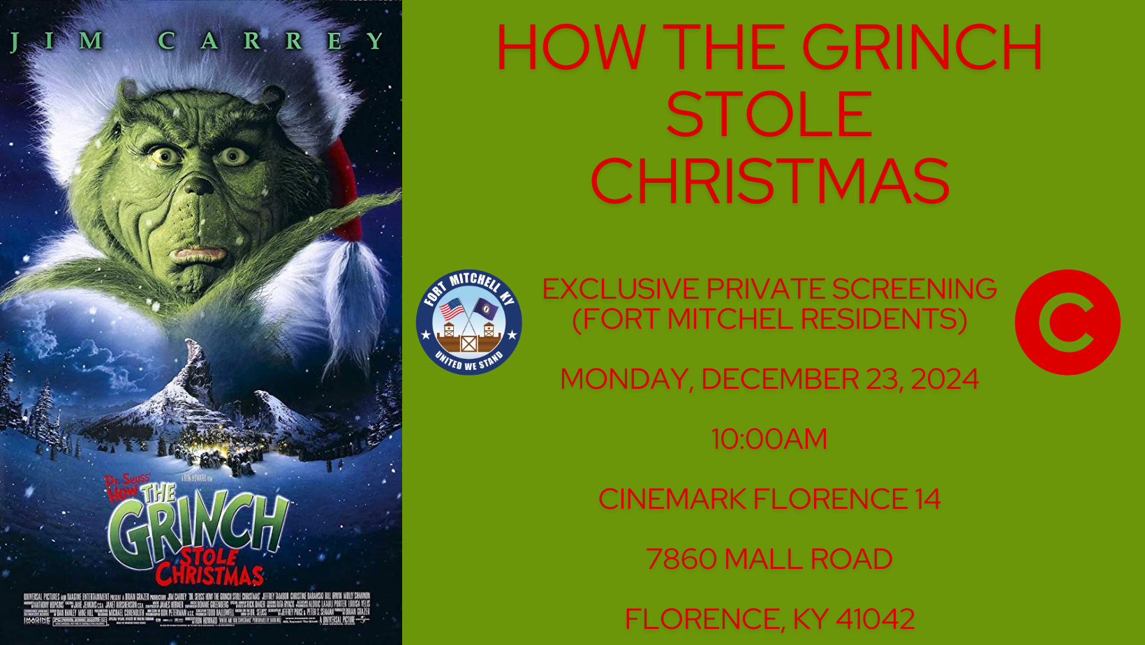 SOLD OUT! Discounted tickets for Fort Mitchell residents go on sale Monday, November 6, 2023! The Grinch Private Screening (Fort Mitchell Morning) Monday, December 18, 2023 10:00am Cinemark Florence 14 7860 Mall Road, Florence, KY 41042 (For Fort Mitchell Residents) The City of Fort Mitchell will be offering a limited number of $3 discounted tickets […]