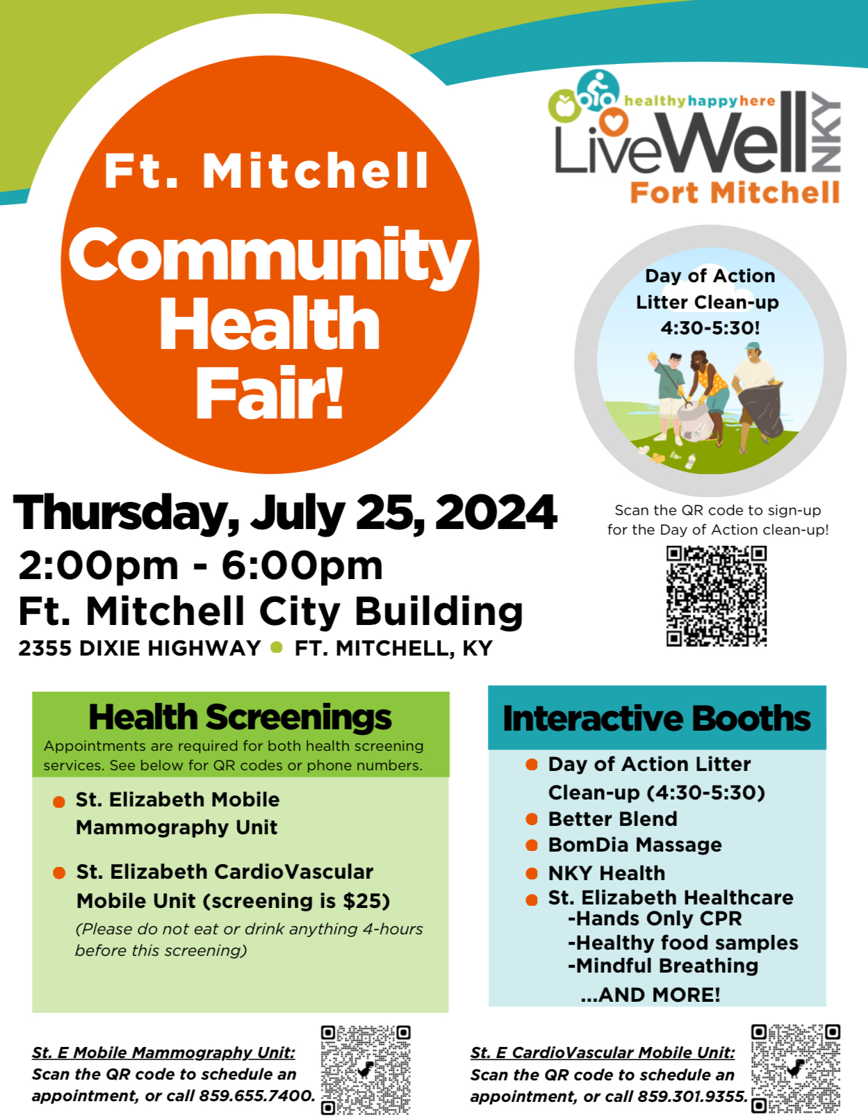 LiveWell Fort Mitchell Community Health Fair Thursday, July 25, 2024 2:00pm – 6:00pm Fort Mitchell City Building (Parking Lot) 2355 Dixie Highway Fort Mitchell, KY 41017