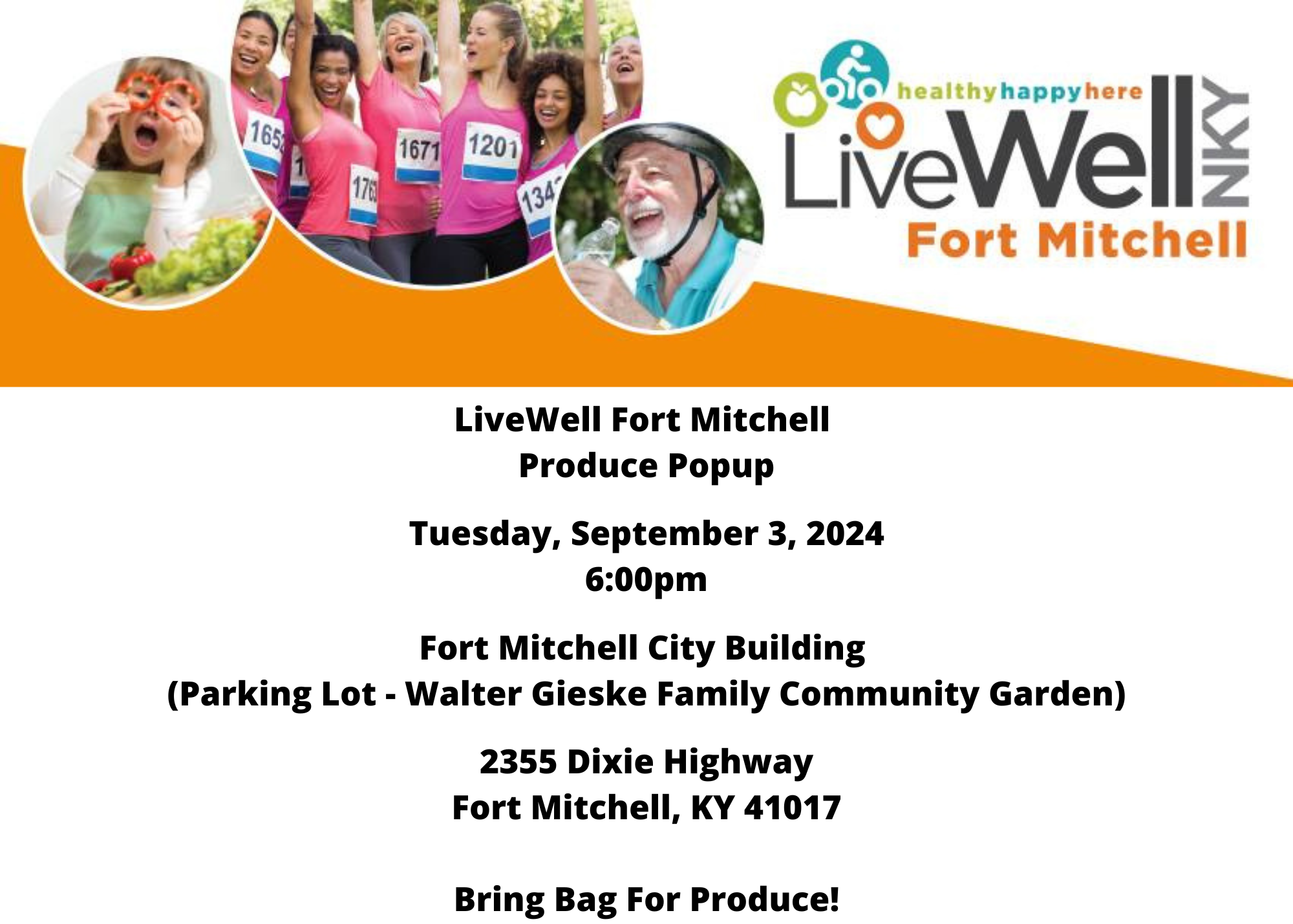 LiveWell Fort Mitchell Produce Popup Tuesday, September 3, 2024 6:00pm Fort Mitchell City Building (Parking Lot - Walter Gieske Family Community Garden) 2355 Dixie Highway Fort Mitchell, KY 41017 Bring Bag For Produce!