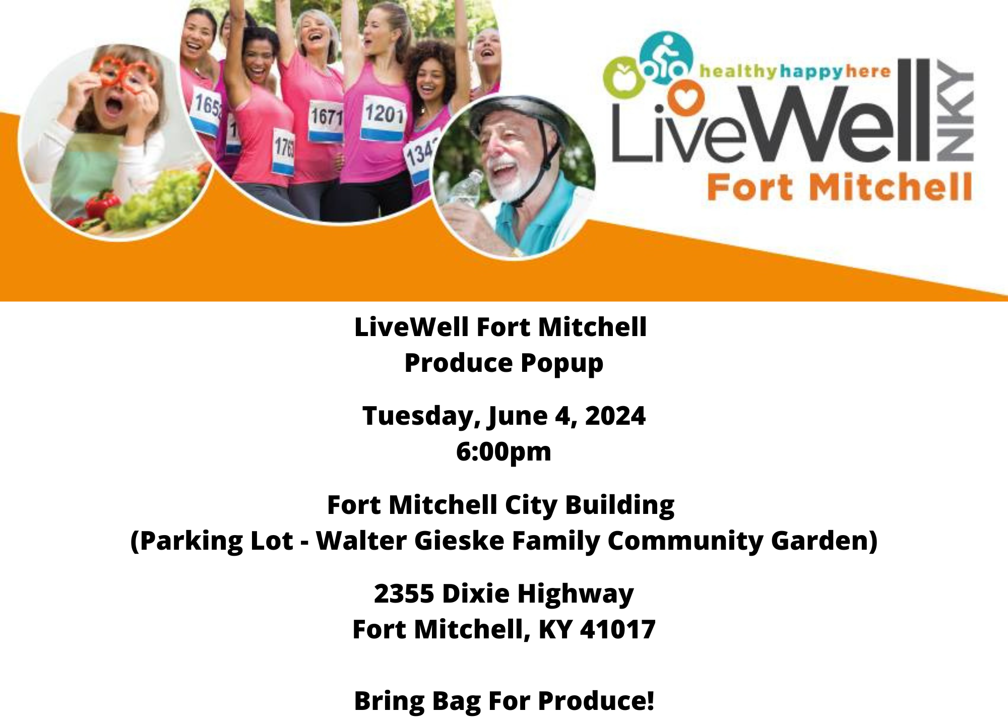 LiveWell Fort Mitchell Produce Popup Tuesday, June 4, 2024 6:00pm Fort Mitchell City Building (Parking Lot - Walter Gieske Family Community Garden) 2355 Dixie Highway Fort Mitchell, KY 41017 Bring Bag For Produce!