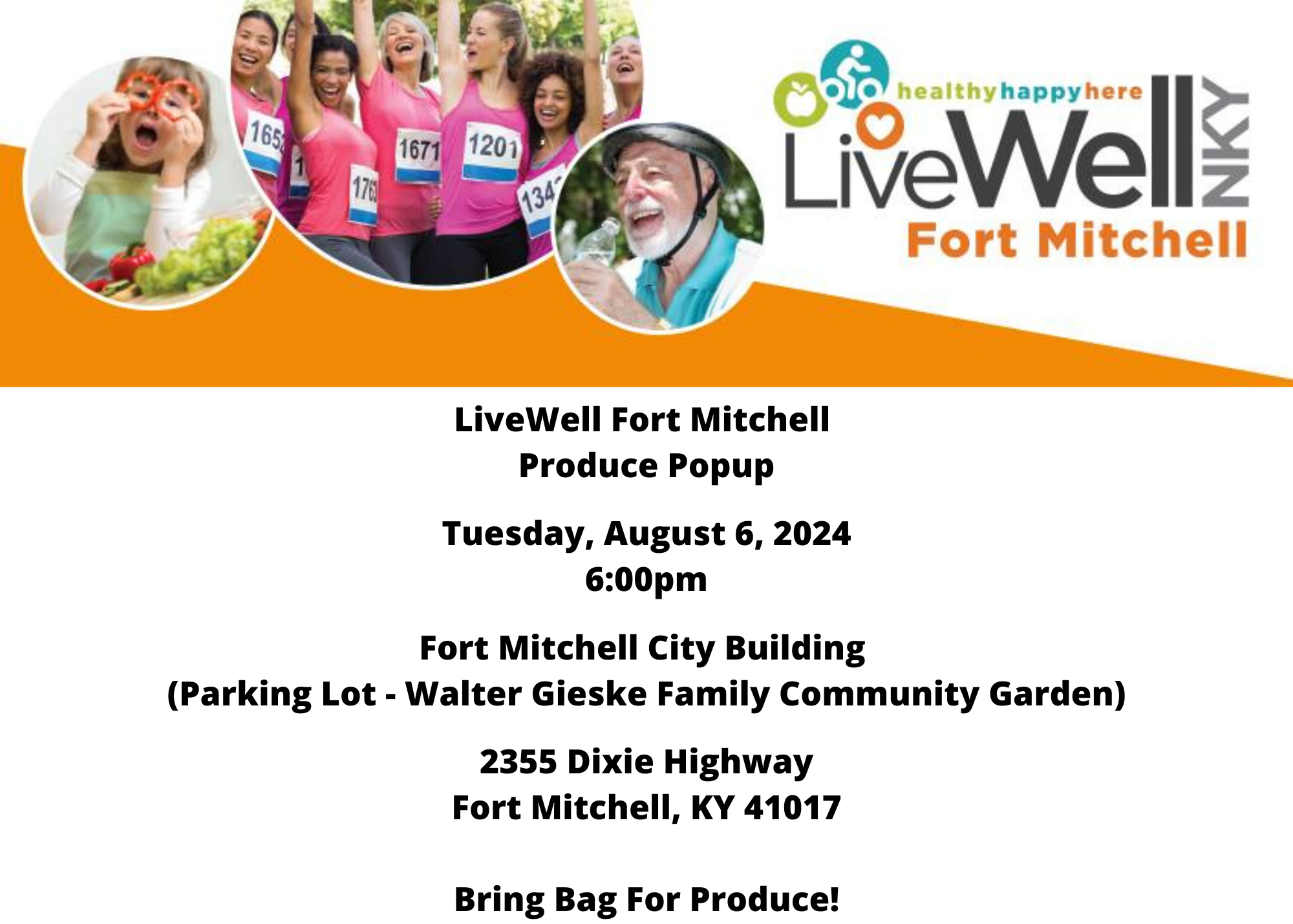 LiveWell Fort Mitchell Produce Popup Tuesday, August 6, 2024 6:00pm Fort Mitchell City Building (Parking Lot - Walter Gieske Family Community Garden) 2355 Dixie Highway Fort Mitchell, KY 41017 Bring Bag For Produce!