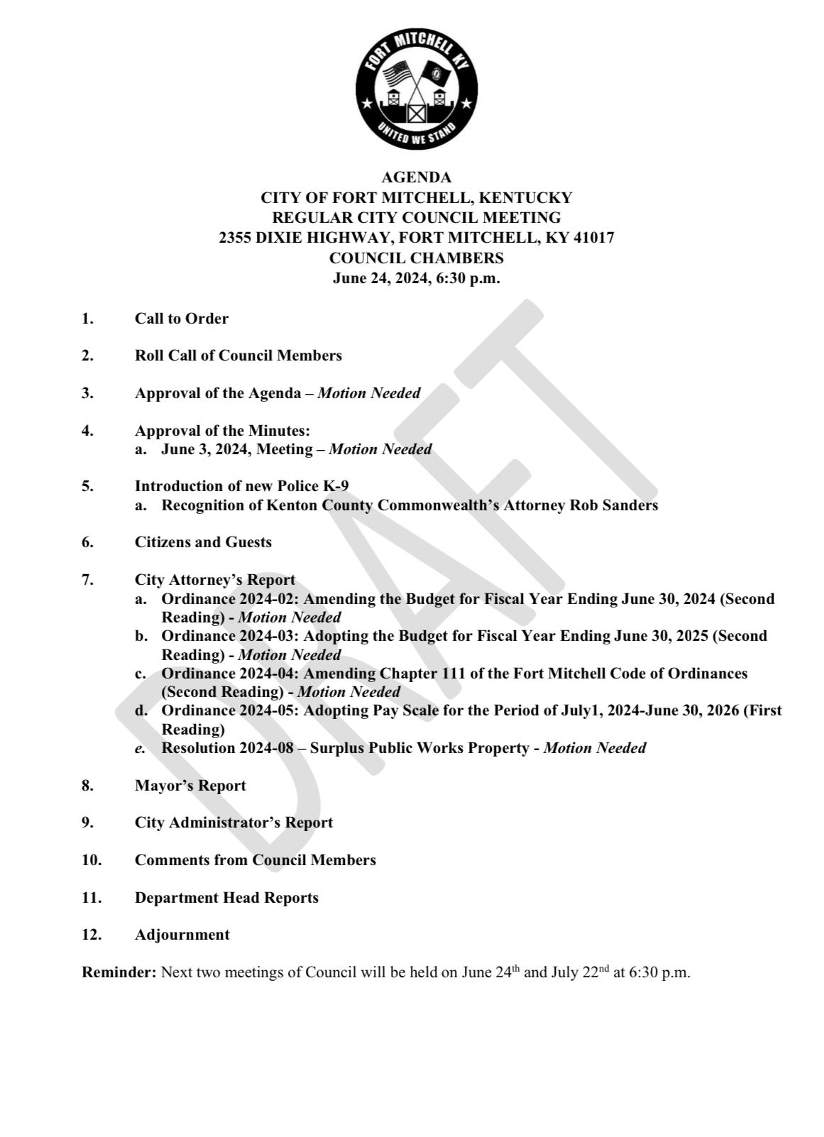City of Fort Mitchell Council Meeting Agenda 6-24-24 City of Fort Mitchell City Council Meeting Monday, June 24, 2024 6:30pm City Building (Council Chamber) 2355 Dixie Highway Fort Mitchell, KY 41017