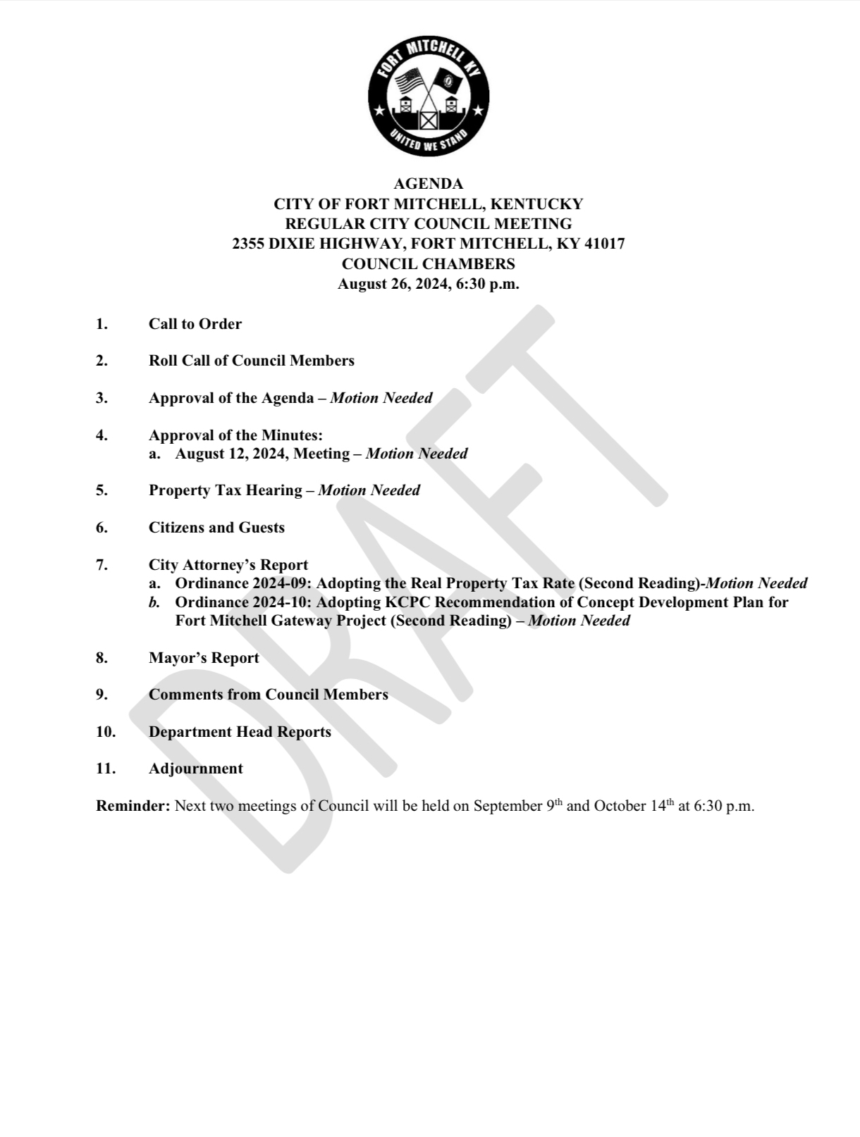 City of Fort Mitchell Council Meeting Agenda 8-26-24 City of Fort MitchellCity Council MeetingMonday, August 26, 20246:30pmCity Building (Council Chamber)2355 Dixie HighwayFort Mitchell, KY 41017