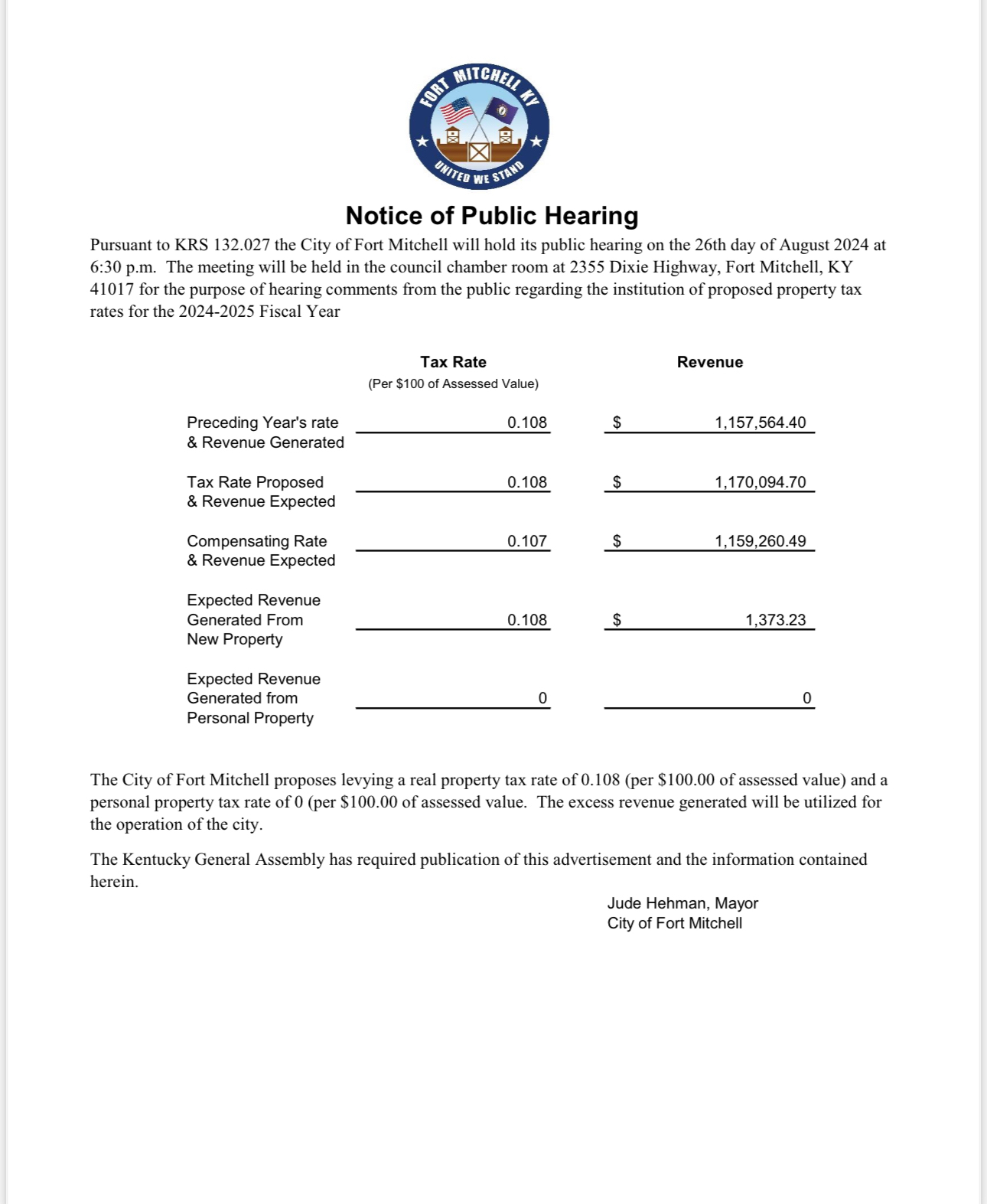 City of Fort Mitchell Tax Rate Public Hearing 8-26-24 City of Fort Mitchell Tax Rate Public Hearing Monday, August 26, 2024 6:30pm Fort Mitchell City Building (Council Chamber) 2355 Dixie Highway Fort Mitchell, KY 41017
